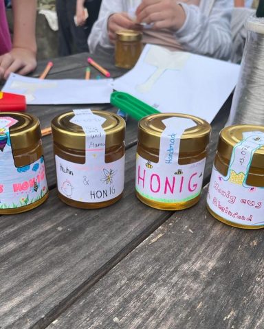 Neben kurzen Erklärungen gibt es viel Zeit für praktisches Erleben. Die Teilnehmenden können basteln, handwerklich tätig werden und – gut geschützt – einen direkten Einblick in ein Bienenvolk bekommen. Je nach Jahreszeit wird auch Honig geerntet. Ein besonderes Highlight ist das Gestalten eines eigenen Honigetiketts, das als schöne Erinnerung mit nach Hause genommen werden kann.